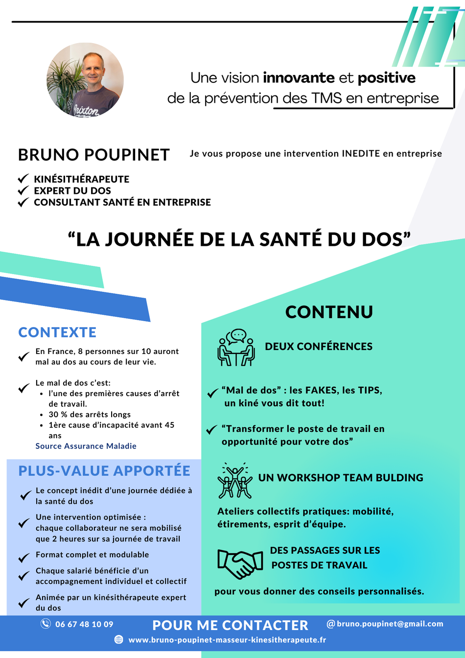 Kinésithérapeute, expert du dos, je propose des actions concrètes et adaptées aux réalités de l’entreprise.